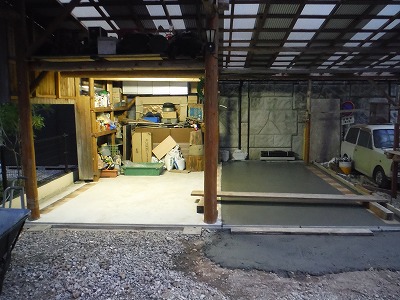 左官屋さんが座っていることろは、駐車場の3分の1で約2年前くらいにコンクリートを打ったスペース。