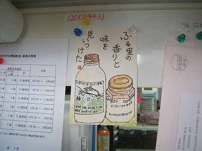 「梅シロップ」とショウガの「コンフィチュール」の絵葉書でした。自作のシールを空き瓶に貼ってあったのですが、原材料名などとともに製造者として僕の住所を書いていたもんですから、その住所に送ってくれたわけです。とても心温まる上手な絵でお気に入りとして会社の机の前に飾っています。