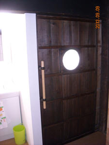 次の日は、月のイメージで扉に明り取り制作、古いガラスをカットしていれてます。